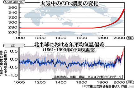 CO2濃度は、1800年頃までは280ppm程度で一定に推移していたのに対し、産業革命が始まる19世紀からは、CO2濃度が増大しています。また、2000年までの北半球の過去1000年間の年平均気温変化(氷床や年輪・サンゴなどから解析)を、1961年〜1990年の30年平均値と比較した気温偏差からは、20世紀の気温上昇が、過去1000年のどの世紀にも見られないほど急激であり、いかに20世紀の気温上昇が異常であるかがわかります。