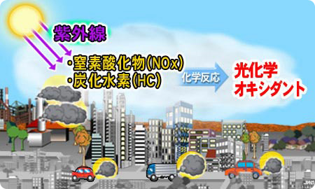 光化学スモッグは、自動車や工場・事業場などから排出される大気中の窒素酸化物や炭化水素(特に不飽和炭化水素)が太陽光線(紫外線)を受けて、光化学反応により二次的汚染物質を生成することにより発生します。 二次的汚染物質としては、オゾン、パーオキシアセチルナイトレイト(PAN)及び二酸化窒素等の酸化性物質、ホルムアルデヒド、アクロレイン等の還元性物質がありますが、ほとんどがオゾンです。光化学反応により生成される酸化性物質のうち、二酸化窒素を除いたものを「光化学オキシダント」と呼んでいます。 |