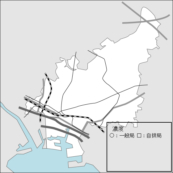 地図表示選択した物質について、全測定局の1時間値を地図上で見ることができます。