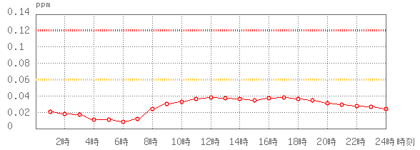 ※グラフ中には0.060ppm(環境基準:1時間値)と0.120ppm(注意報発令の基準:1時間値)に参考として線を記載しています。